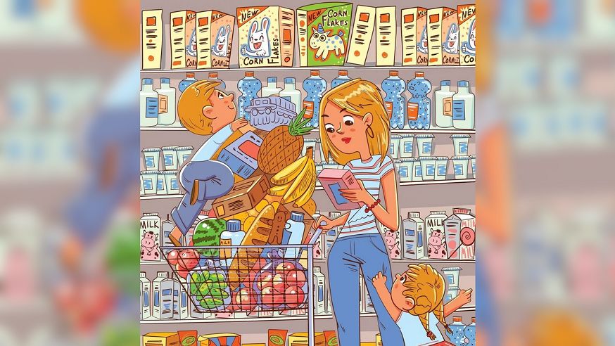 Obrazek przedstawia robiącą zakupy matkę z dwójką dzieci. Na pierwszy rzut oka wszystko wygląda zwyczajnie, ale gdzieś wśród półek sklepowych ukryła się świnka. Twoim zadaniem jest odnaleźć ją jak najszybciej.